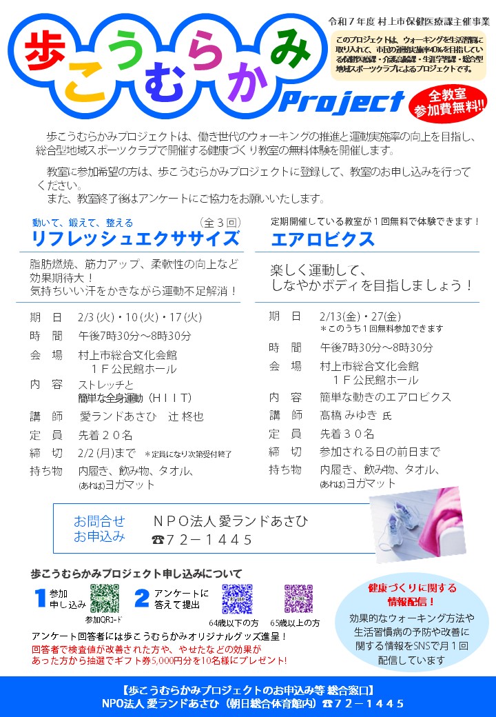 ◎歩こうむらかみプロジェクト「リフレッシュエクササイズ」・「エアロビクス」歩こうむらかみプロジェクトでは、働き世代のウォーキングの推進と運動実施率の向上を目指し、総合型地域スポーツクラブで開催する健康づくり教室の無料体験を開催します。〇リフレッシュエクササイズ期日 R8/2/2(火)・2/9(火)・2/17(火) 全3回時間 19:30~20:30会場 村上市総合文化会館〇エアロビクス期日 R8/2/13(金)・2/27(金)※このうち1回無料で参加できます時間 19:30~20:30会場 村上市総合文化会館
